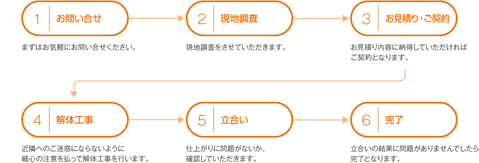 お問い合せをいただいてから完了まで責任を持って解体工事をさせていただきます。