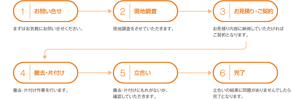 お問い合せをいただいてから完了まで責任を持って撤去・片付け作業をさせていただきます。