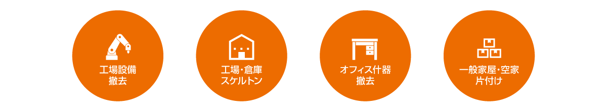 工場などの機械設備やオフィスなどの什器の撤去、一般家屋や空家の片付け作業、スケルトン工事など撤去・片付けに関する作業ならなんでもお任せください。